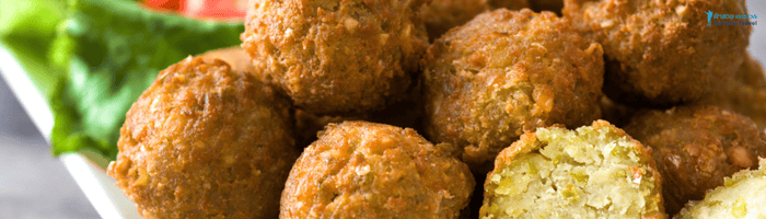 “ฟาลาเฟล” คือลูกชิ้นถั่วชิกพีทอด กรอบนอกนุ่มใน รสชาติเผ็ดนิด ๆ กินกับขนมปังพิต้าพร้อมซอสโยเกิร์ต