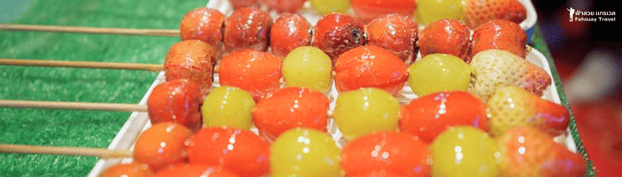 ของหวานยอดฮิตในจีน “ปิงถังหูลู่” คือผลไม้เสียบไม้เคลือบน้ำตาล กรอบหวานอร่อยสุด ๆ ปกติใช้ผลไม้เปรี้ยวอย่างพุทราจีน สตรอว์เบอร์รี่ หรือองุ่น
