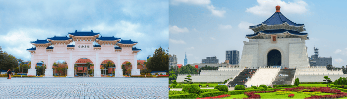 อนุสรณ์สถานเจียงไคเชก สร้างขึ้นตั้งแต่ ปี ค.ศ.1976 เพื่อเป็นการรำลึกถึง อดีตประธานาธิบดี เจียง ไคเชก ซึ่งตัวอาคารจะเป็นลักษณะทรงสี่เหลี่ยม หลังคาสีน้ำเงินทรงแปดเหลี่ยม ออกแบบด้วยสถาปัตยกรรมแบบจีน มีขั้นบันไดขึ้นไปด้านบน 89 ขั้น เท่ากับอายุของอดีตประธานาธิบดีเจียง ไคเชก