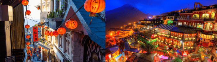 หมู่บ้านโบราณจิ่วเฟิ่น เป็นหมู่บ้านโบราณที่ยังคงความงามของไต้หวันตั้งแต่ในอดีตไว้ได้เป็นอย่างดี แต่ก่อนที่นี่เคยเป็นแหล่งเหมืองทองที่มีชื่อเสียง มีนักขุดทองพากันมาที่นี่มากมายจนทำให้แร่ลดลงไปอย่างมาก ต่อมาได้มีการใช้ที่นี่เป็นสถานที่ถ่ายทำภาพยนตร์