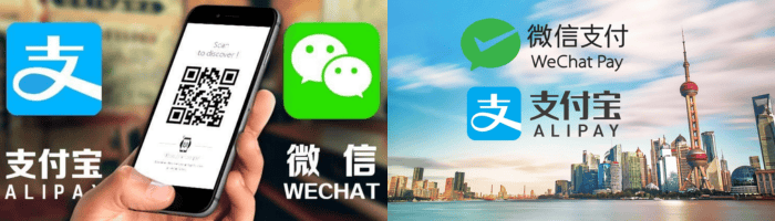 Alipay และ Wechat Pay เพราะเป็นสองยักษ์ใหญ่ของจีนที่ให้บริการระบบชำระเงินผ่านโทรศัพท์มือถือ และเป็นสองแอปพลิเคชันที่คนจีนนิยมใช้กันมาก จึงจ่ายได้แทบทุกร้าน เมื่อก่อนการใช้งานแอปนี้ค่อนข้างยุ่งยากมากสำหรับนักท่องเที่ยวต่างชาติ เพราะต้องมีบัญชีธนาคารที่จีนด้วย แต่ในตอนนี้สามารถให้นักท่องเที่ยวสามารถผูกบัญชีกับบัตรเครดิต หรือบัตรเดบิตได้แล้ว และสามารถเติมเงินเข้าบัญชีได้อย่างรวดเร็ว ซึ่งรูปแบบการใช้งานนั้นง่ายมาก แค่เปิดแอป สแกน QR Code ก็สามารถชำระเงินได้เลย สามารถใช้ได้ทั้งในการสั่งอาหาร เรียกแท็กซี่ จ่ายค่ารถไฟใต้ดิน ค่าทางด่วน ค่าจอดรถ จองโรงแรม หรือใช้จ่ายผ่านร้านค้าที่มีสัญลักษณ์ Alipay ได้เลยค่ะ