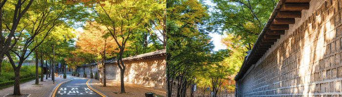 ถนนสายโรแมนติคถ็อกซูกุง (Deoksugung Doldam-gil หรือ Deoksugung Stone-wall Road)😍❤️ มีระยะทางยาว 900 เมตร เป็นผนังหินของพระราชวังท็อกซูกุง(Deoksugung Palace) เดิมเคยเป็นผนังหินแห่งแรกในเกาหลีที่สร้างให้ครอบคลุมพื้นที่ที่อยู่อาศัยของผู้คนกับสิ่งแวดล้อมไว้ร่วมกันอย่างลงตัว❕(✧∀✧) ระหว่างทางเต็มไปด้วยต้นไม้กว่า 130 ต้น และมีม้านั่งอีก 20 ที่ 🌫️🪑☁️ บรรยากาศที่ร่มรื่นและโรแมนติกเป็นสถานที่ที่ดีสำหรับพักผ่อนหย่อนใจ และในช่วงฤดูใบไม้เปลี่ยนสีประมาณเดือน พฤศจิกายน ใบแปะก๊วยจะพร้อมใจกันเปลี่ยนเป็นสีส้มเหลือง🍂🌳 ยาวตลอดแนวกำแพง ทำให้เป็นหนึ่งในถนนเส้นที่มีเสน่ห์ที่สุดเขาโซล ^ㅁ^✅