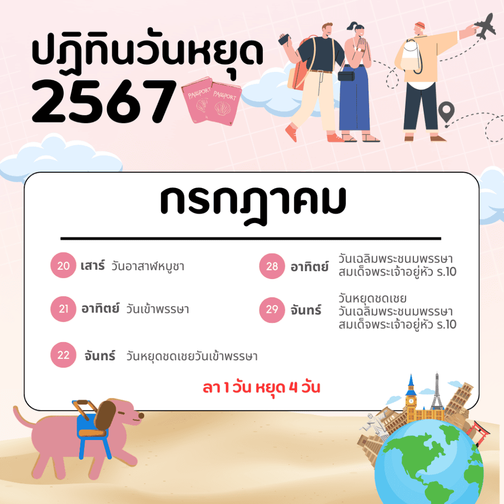 📢 ช่วงกลางปีที่มีวันหยุดเยอะแบบนี้ และประเทศไทยที่เข้าสู่ช่วงฤดูฝนพอดี จะมีประเทศไหนพอจะให้เราไปหลบฝนกันได้บ้าง อย่าลืมชวนเพื่อน ๆ หรือคนในครอบครัวเก็บกระเป๋าไปเที่ยววันหยุดยาวกัน เพราะเดือนกรกฎาคมมีวันหยุดถึง 5 วันเลยน้าาาาา ไปดูกันเลยค่ะว่าในเดือนกรกฎาคมมีวันหยุดวันไหนและหยุดเนื่องในโอกาสอะไรบ้าง ไปดูกันเล๊ยยยย ✨