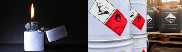 ของอีกหนึ่งประเภทที่ห้ามนำขึ้นเครื่องบินก็คือ วัตถุไวไฟ วัตถุระเบิด เนื่องจากอาจเป็นต้นเหตุของเพลิงไหม้ และสร้างความเสียหายให้กับตัวเครื่อง รวมถึงผู้โดยสารท่านอื่นๆ หรือร้ายแรงที่สุดอาจทำให้เสียชีวิต ซึ่งนอกจากจะห้ามนำขึ้นเครื่องบินแล้ว ยังมีคำพูดที่ห้ามพูดในสนามบินและบนเครื่องบินอีกด้วย เพราะอาจสร้างความแตกตื่น รวมถึงต้องมีการตรวจสอบความปลอดภัยเพิ่มเติม