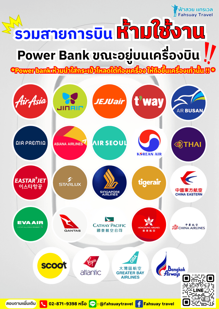 โดยการนำพาวเวอร์แบงก์ขึ้นเครื่องบินจะต้องพกติดตัวเท่านั้น ห้ามโหลดใต้เครื่อง และเพื่อความปลอดภัย บางสายการบินจึงมีกฎ ห้ามใช้งานพาวเวอร์แบงค์ขณะอยู่บนเครื่องบินตลอดการเดินทาง โดยพี่เห็ดได้รวมสายยการบินที่มีกฎดังกล่าวมาไว้ให้ ดังนี้