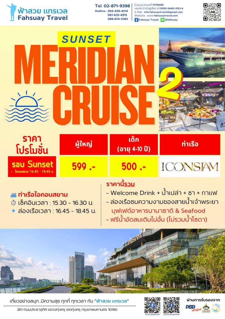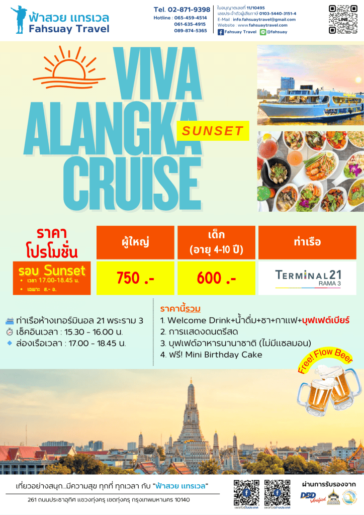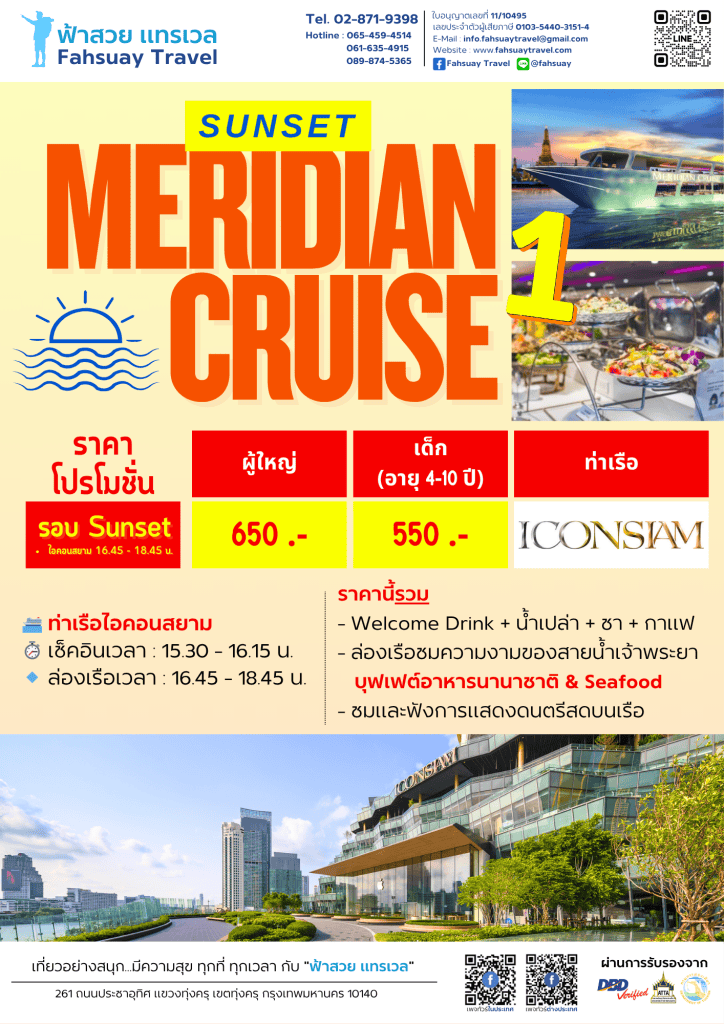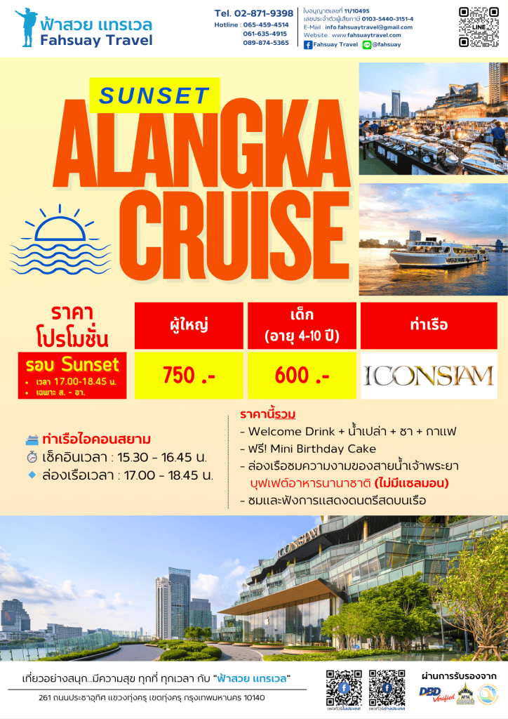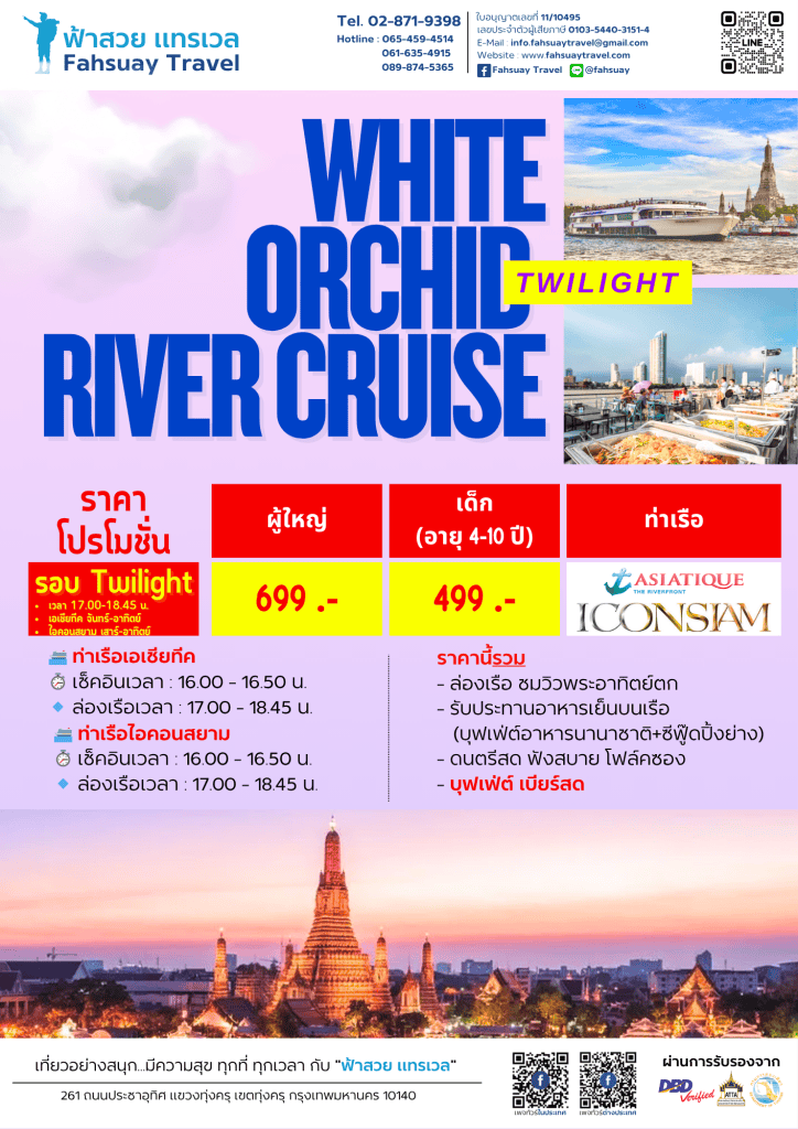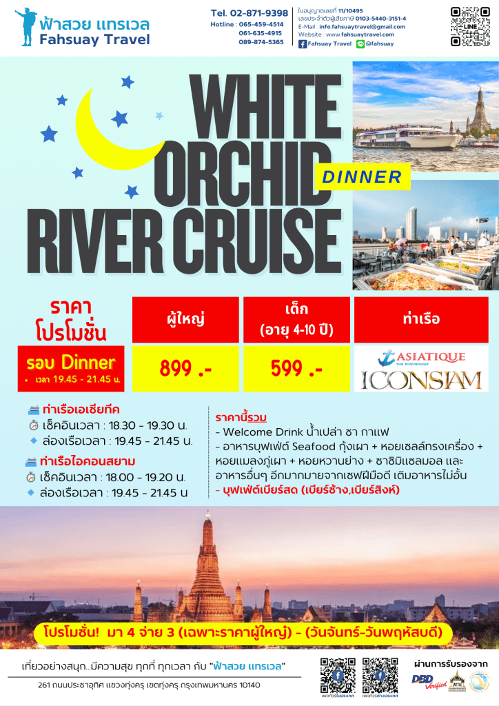 โดยมี🌌รอบค่ำให้คุณชมแสงไฟประดับสถานที่สำคัญริมแม่น้ำเจ้าพระยา และ🌅รอบซันเซ็ตที่มอบบรรยากาศอันอบอุ่นของพระอาทิตย์ลับขอบฟ้า ทั้งสองรอบเรือล่องผ่านสถานที่สำคัญ เช่น วัดอรุณราชวราราม ไอคอนสยาม วัดพระแก้ว สะพานพระราม 8 และเอเชียทีค เดอะ ริเวอร์ฟร้อนท์