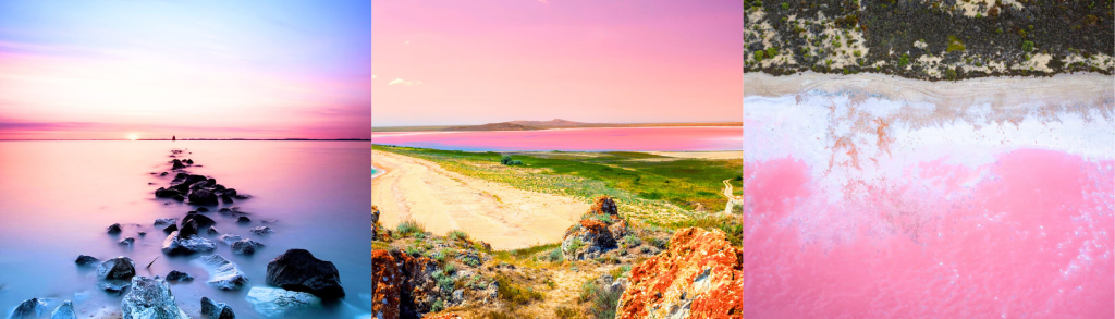 ทะเลสาบสีชมพูสดตัดกับมหาสมุทรสีน้ำเงินแบบชัดมาก สีเกิดจากจุลินทรีย์ธรรมชาติ มองจากมุมสูงคือว้าวสุด ๆ เหมือนภาพตัดต่อเลย 🌷