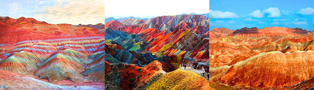 ภูเขาหลากสีเหมือนระบายสีลงบนผืนดิน เกิดจากชั้นหินแร่ธาตุทับถมกันหลายล้านปี ช่วงพระอาทิตย์ขึ้น–ตก สีจะยิ่งสดสวยเหมือนภาพวาด 🎨