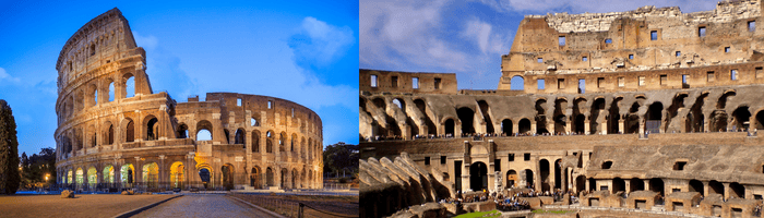 โคลอสเซียม (Colosseum) เป็นสนามกีฬาโบราณที่ยิ่งใหญ่ที่สุดในขณะนั้น สนามกีฬากลางแจ้งขนาดใหญ่ตั้งอยู่ใจกลางกรุงโรมนี้ เริ่มสร้างขึ้นใน สมัยจักรพรรดิเวสเปเซียน แห่งจักรวรรดิโรมัน และสร้างเสร็จในสมัยของจักรพรรดิไททัส ใช้เวลาการก่อสร้างถึง 10 ปีด้วยกัน ที่แห่งนี้มีห้องสำหรับขังทาส นักโทษ และสัตว์ดุร้าย เช่น สิงโต เสือ โดยจะให้ทาสสู้กันเองจนกว่าจะเหลือผู้รอดชีวิตเพียงคนเดียว หรือให้สู้กับสิงโต เพื่อเป็นความบันเทิงให้แก่ผู้ชม ผู้ที่รอดตายจากการต่อสู้จึงจะได้รับอิสรภาพ โคลอสเซียม เป็นรูปวงกลมก่อด้วยอิฐ และหินทราย วัดโดยรอบได้ประมาณ 527 เมตร สูง 57 เมตร สามารถจุผู้ชมได้ประมาณ 50,000 คน และนอกจากนี้ยังมีการออกแบบอย่างชาญฉลาด โดยสร้างให้สนามกีฬามีลักษณะเป็นรูปวงรี เพื่อให้ผู้ชมรู้สึกเข้าใกล้นักกีฬา และมีการออกแบบทางระบายน้ำเพื่อไม่ให้น้ำท่วมขังในสนามขณะเกิดฝนตกอีกด้วย โคลอสเซียมจึงกลายเป็นต้นแบบของสนามกีฬาต่างๆ ในปัจจุบันนั่นเอง