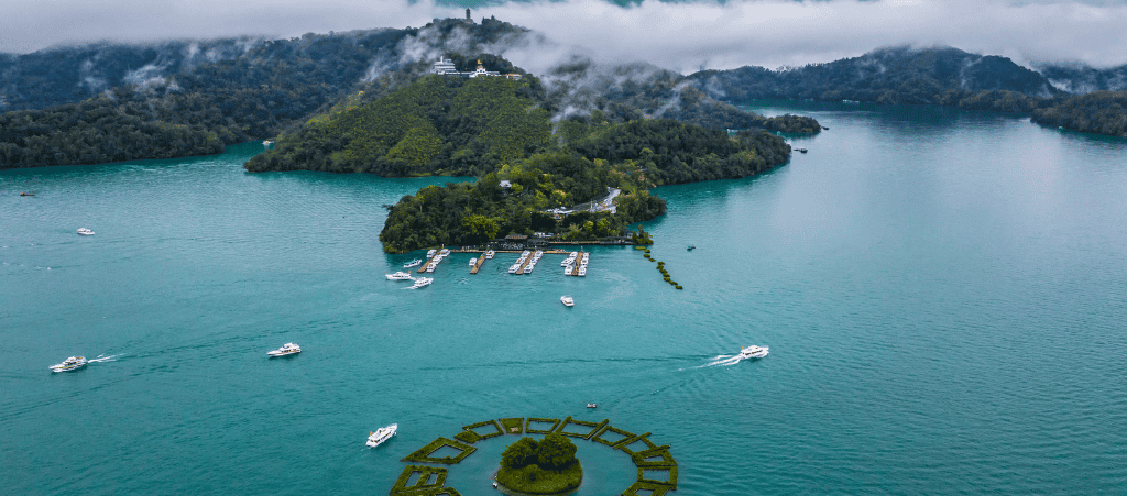 2.ทะเลสาบสุริยันจันทรา หรือ Sun Moon Lake ตั้งอยู่บริเวณเชิงเขาของเทือกเขาไต้หวัน ทะเลสาบรายล้อมไปด้วยภูเขา ต้นไม้ และหมู่บ้านชนบท มีเส้นทางเดินเท้า แถมยังได้รับการขนานนามให้เป็น 1 ใน 13 พื้นที่ที่สวยที่สุดในไต้หวัน และเป็นทะเลสาบที่ใหญ่ที่สุดด้วย ในสมัยก่อนบริเวณรอบๆจะมีเล็กๆอยู่มากมาย ส่วนในปัจจุบันมีวัด Wen Wu ซึ่งเป็นวัดสำคัญประจำทะเลสาบแห่งนี้ และมีการสร้างวัดอื่นๆตามมาภายหลัง