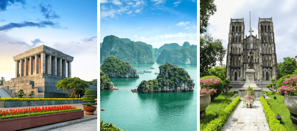 สถานที่ท่องเที่ยวได้แก่ สุสานโฮจิมินห์ , โบสถ์เซนต์โจเซฟ , อ่าวฮาลอง , จตุรัสซาปา , ยอดเขาฟานซีปัน , หมู่บ้านกั๊ตกั๊ต , สะพานแก้วมังกรเมฆ , เมืองนิงห์บิงห์ เป็นต้น