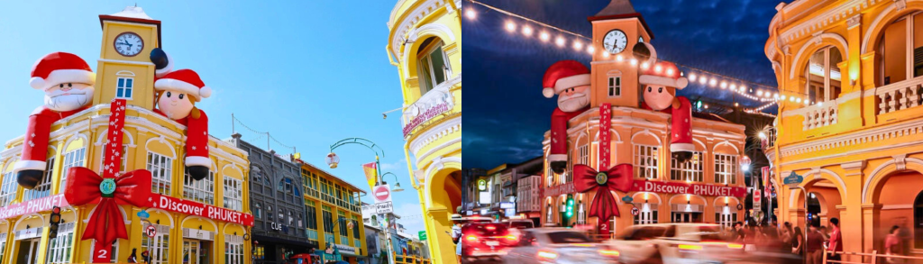 เมืองเก่าเต็มไปด้วยตึกสีสันสไตล์ชิโน-โปรตุกีส คาเฟ่และร้านอาหารตกแต่งไฟคริสต์มาส มุมถ่ายรูปสวยทั้งกลางวันและกลางคืน เหมาะกับคนที่ชอบเดินเล่นชิล ๆ พร้อมดื่มกาแฟหรือขนมท้องถิ่น