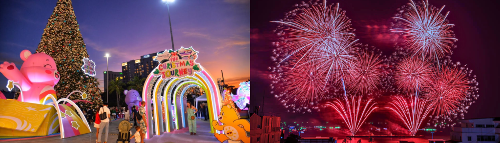 เมืองท่องเที่ยวที่มีเทศกาล Pattaya Countdown พร้อมไฟประดับทั่วเมือง และกิจกรรมคริสต์มาสสำหรับทุกวัย สามารถเดินเล่นริมชายหาด ชมการแสดง และถ่ายภาพสวย ๆ กับแสงไฟยามค่ำคืน