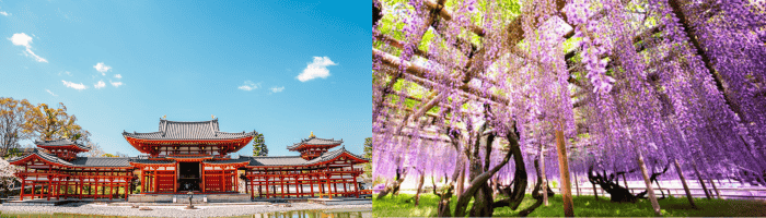ปิดท้ายไปชมดอกวิสทีเรียในเมืองหลวงเก่าอย่าง เกียวโต แนะนำให้ไปที่ วัดเบียวโดอิน วัดเก่าแก่ที่สำคัญ ตั้งอยู่ที่เมืองยูจิ เมืองเล็กๆ ทางใต้ของเกียวโต โด่งดังว่าเป็นวัดที่สวยงามด้วยสถาปัตยกรรมอาคารหลักของวัดที่สร้างขึ้นอย่างสมมาตร ล้อมรอบด้วยสระน้ำและสวนแบบญี่ปุ่นที่สวยงาม ในช่วงฤดูใบไม้ผลิจะมีดอกไม้หลากหลายชนิดให้ชมทั่วบริเวณ โดยเฉพาะระแนงไม้ปลูกดอกวิสทีเรีย บริเวณด้านข้างของอาคารหลัก เป็นแนวดอกไม้สีม่วงส่งกลิ่นหอมไปทั่วพื้นที่ ถ่ายรูปจากมุมนี้ได้สวยละมุนมากๆ