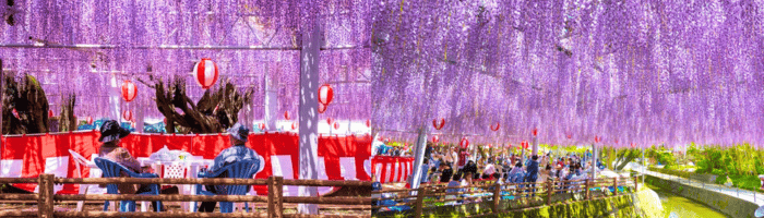 สวนอาชิคางะ ตั้งอยู่ที่เมืองอาชิคางะ จังหวัดโทชิงิ โดยอยู่ห่างจากโตเกียวไปราว 80 กิโลเมตร แถมยังสามารถเดินทางจากโตเกียวได้อย่างสะดวกสบาย ไปเช้า-เย็นกลับได้เลยค่ะ ที่สวนแห่งนี้มีต้นวิสทีเรียขนาดใหญ่ที่มีอายุถึง 150 ปี และยังมี อุโมงค์วิสทีเรีย สีขาวที่มีความยาวถึง 80 เมตร นอกจากนี้ภายในอุโมงค์ยังมีดอกวิสทีเรียสีเหลือง และวิสทีเรียสายพันธ์อื่นๆ ออกดอกบานสะพรั่งอีกมากกว่า 350 ต้น ซึ่งนอกจาก วิสทีเรีย ญี่ปุ่น แล้ว ที่นี่ยังมีดอกไม้นานาชนิดให้ได้ชมกันทั่วสวนที่มีความกว้างเกือบ 2,000 ตารางเมตร และที่นี่ก็เป็นสถานที่ท่องเที่ยวแนะนำโดย CNN เช่นกัน