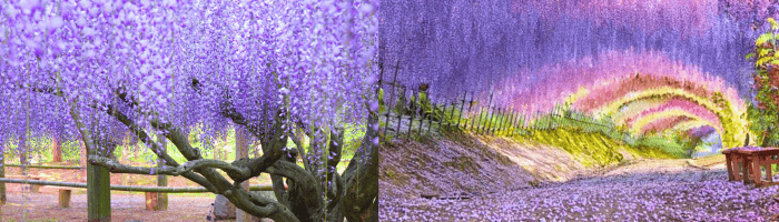 เทศกาล ดอกวิสทีเรีย ที่แรก เป็นสถานที่ที่มีชื่อเสียงที่สุดในญี่ปุ่น ก็คือ สวนคาวาจิ ฟูจิ การ์เดน (Kawachi Fuji Garden) ในเมืองคิตะคิวชู จังหวัดฟุกุโอกะ ที่มีซุ้ม อุโมงค์ดอกวิสทีเรีย ให้เดินลอดเป็นทางยาว เรียกได้ว่าเป็นสถานที่แสนงดงามราวกับเดินอยู่ในอุโมงค์แห่งสรวงสวรรค์เลยทีเดียว