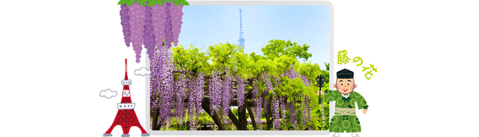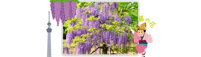 ศาลเจ้าคะเมโดะเท็นจิน นับว่าเป็นสถานที่ที่ดีที่สุดสำหรับการชม ดอกวิสทีเรีย โตเกียว เบื้องล่างโครงไม้ระแนงคือสระน้ำที่เงียบสงบ สร้างภาพสะท้อนอันสวยงามไม่เหมือนใครของดอกไม้สีม่วงบนผิวน้ำ ดอกวิสทีเรียที่ศาลเจ้าแห่งนี้ ในบันทึกระบุว่า สึนะโยชิ โชกุนโทคุงาวะลำดับที่ 5 และ โยชิมุเนะ โชกุนโทคุงาวะลำดับที่ 8 เคยเดินทางมาเยี่ยมชม ด้วยวิวทิวทัศน์ที่งดงาม เงาสะท้อนจากบ่อน้ำเป็นสีม่วงของดอกวิสทีเรียที่ห้อยระย้าลงมายาวเป็นทางเดิน