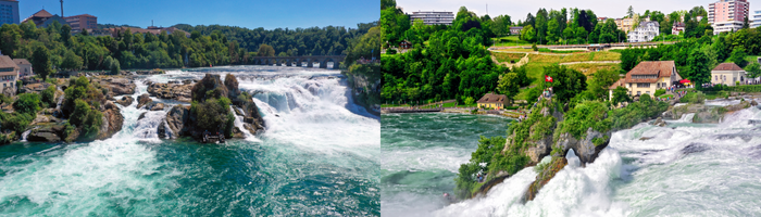 น้ำตกไรน์ เป็นน้ำตกที่ใหญ่ที่สุดในยุโรป ไหลลงมาจากเทือกเขาแอลป์ มีความสูงถึง 23 เมตร กว้าง 150 เมตร ในฤดูร้อนจะมีมวลน้ำมหาศาลไหลลงมาถึง 700 ลูกบาศก์เมตรต่อวินาที มากกว่าฤดูหนาวถึง 3 เท่า! ส่งเสียงดังกึกก้องราวกับฟ้าคำราม พร้อมละอองน้ำที่สาดกระเซ็นไปทั่ว รอบๆ มีจุดชมวิวพาโนรามาหลายแห่ง ทั้งระเบียงที่ยื่นไปกลางน้ำ และจุดชมวิวปราสาทเลาเฟิน (Schloss Laufen) ที่มีทางเดินใกล้น้ำตก นอกจากนี้ยังนั่งเรือไปเกาะกลางน้ำ สัมผัสความยิ่งใหญ่ของน้ำตกแบบใกล้ชิดได้ด้วย