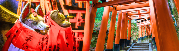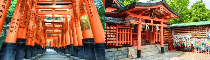 ศาลเจ้าเทพอินาริ (Fushimi Inari Shrine) ที่ว่ากันว่าสร้างมายาวนานกว่า 1,000 กว่าปีแล้ว ที่เรามักเรียกว่าศาลเจ้าแดง หรือศาลเจ้าจิ้งจอก เป็นศาลเจ้าที่โด่งดังมากของประเทศญี่ปุ่น เรียกได้ว่า เป็นอีกแห่งหนึ่งที่เป็นสัญลักษณ์ของเมืองเกียวโต ซึ่งจุดที่โด่งดังของที่นี่มาจาก คนญี่ปุ่นเชื่อกันว่าที่นี่ คือภูเขาศักดิ์สิทธ์โดยเฉพาะ เทพอินาริ ที่เป็นตัวแทนการเก็บเกี่ยว พืชผลไร่นาต่าง ๆ ที่มีสัตว์คู่กายเป็นจิ้งจอก
