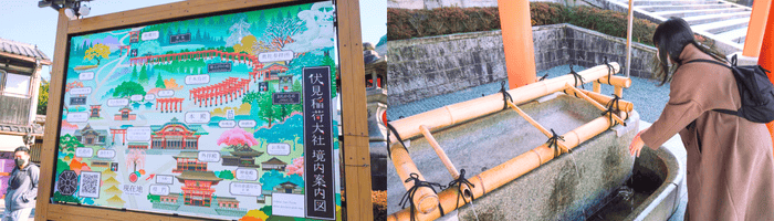 ซึ่งเราจะเห็นงานประติมากรรมรูปจิ้งจอกมากมายหลายแห่งในศาลนี้เลย และก่อนทางเข้าก็มีธรรมเนียมให้ ล้างมือ ล้างปาก ซึ่งจะมีที่ให้ล้างมือ ล้างปากให้ด้วย เรียกว่า อ่างน้ำ Temizuya