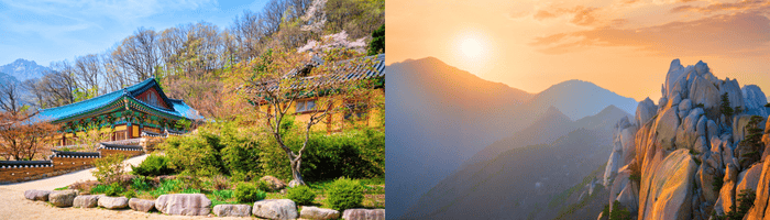 ใครอยากชมใบไม้เปลี่ยนสีพร้อมสัมผัสอากาศเย็นๆ ก่อนใคร ช่วงปลายเดือนกันยายนแนะนำให้ไป เกาหลีใต้ เที่ยว อุทยานแห่งชาติซอรัคซาน (Seoraksan National Park) ซึ่งเป็นสถานที่แรกๆ ในเกาหลีที่ใบไม้จะเริ่มเปลี่ยนสี สำหรับอุทยานแห่งชาติซอรัคซานจะมียอดเขาหลายยอด ซึ่งคนเกาหลีจะนิยมไปที่ ยอดเขา Gwongeumseong Fortress ทางตะวันออกของซอรัคซาน เพราะมีกระเช้าลอยฟ้านั่งขึ้นไปด้านบนได้ จากนั้นเดินต่ออีกประมาณ 1.5 กิโลเมตร ก็จะสามารถพิชิตยอดเขา ได้ชมวิวสวยๆ อากาศข้างบนก็เย็นสบาย ใกล้กับทางขึ้นกระเช้ามี วัดชินฮึงซา (Sinheungsa Temple) ที่มีพระพุทธรูปองค์ใหญ่ให้เราไปสักการะ เป็นวัดที่มีความเก่าแก่และมีความศักดิ์สิทธิ์มากที่สุดแห่งหนึ่งในเกาหลี ซึ่งทั่วทั้งบริเวณวัดรายล้อมไปด้วยต้นเมเปิ้ลที่จะเปลี่ยนสีเป็นสีส้มแดงอย่างสวยงามในช่วงเวลานี้ ใครอยากไป ทัวร์เกาหลี ชมใบไม้เปลี่ยนสี ต้องวางแผนล่วงหน้านะจ๊ะ