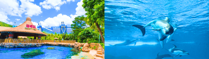 ถ้าอยากชมความน่ารักของน้องโลมาอย่างใกล้ชิดต้องมาโซนนี้เลย โดยน้องๆ โลมาจะแหวกว่ายอยู่ในสระน้ำใสแจ๋ว นักท่องเที่ยวสามารถเดินเข้าไปชมใกล้ๆ ผ่านกระจกใสได้ ทั้งยังมีการจัดแสดงนิทรรศการ, 5D Castle Theatre, การแสดงโลมาที่เราสามารถเพลิดเพลินไปกับความน่ารักและความฉลาดของเจ้าโลมา และที่พลาดไม่ได้ก็คือ เครื่องเล่นสุดมันส์อย่าง Battle of the Pirates ที่จำลองฉากว่าเรากำลังต่อสู้กับโจรสลัด และ Dolphin Round Ride เครื่องเล่นที่เหมาะสำหรับเด็กๆ