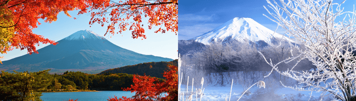 - ฤดูหนาว (เดือนธันวาคม – กุมภาพันธ์) ข้าสู่ช่วงฤดูหนาวอากาศหนาวเย็นจัด เราจะได้เห็นภูเขาไฟฟูจิที่ถูกปกคลุมด้วยหิมะขาวโพลนสวยงาม