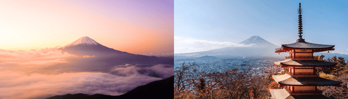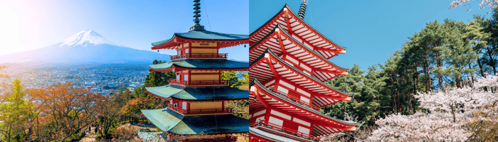 เริ่มกันที่แรกกับภาพสวยๆ ที่หลายคนโดนตก คือ ภูเขาไฟฟูจิ ที่มี เจดีย์ชูเรโตะ (Chureito Pagoda) ตั้งอยู่ทางด้านขวาของภูเขา เป็นเจดีย์ทรงห้าชั้นสีแดงตั้งอยู่บนเนินเขาสูง ช่วงที่ได้รับความนิยมคือช่วงฤดูใบไม้ผลิ หรือในช่วงกลางเดือนเมษายน เพราะดอกซากุระบานสวยงาม และ ฤดูใบไม้ร่วง หรือ ช่วงต้นถึงกลางเดือนพฤศจิกายน วิวตรงนี้ก็จะเต็มไปด้วยใบไม้เปลี่ยนสี บอกเลยว่าสวยงามสุดๆ