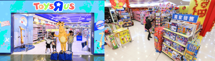 Toys”R”Us เป็นร้านของเล่นยอดนิยมตลอดกาล มีของเล่นทุกชนิด ไม่ว่าจะเป็น ตุ๊กตา กาชาปอง ฟิกเกอร์ ของเล่นเด็กเล็กยันเด็กโต และอีกมากมายสารพัด มาที่เดียวได้ครบทุกอย่างที่อยากได้แน่นอน ซึ่งในฮ่องกงก็มีหลายสาขามากๆ อยู่ตามห้างใหญ่ๆ หรือย่านช้อปปิ้งต่างๆ อย่างเช่น ห้าง Ocean Terminal ในย่านจิมซาจุ่ย, ห้าง Moko ในย่านมงก๊ก หรือจะเป็นที่ ห้าง Windsor House ในย่าน Causeway Bay