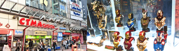 ใครชอบของสะสมไม่ว่าจะเป็นแนวหุ่นยนต์ ฟิกเกอร์ หรือตุ๊กตา บอกเลยว่านี่คือสวรรค์เลยค่ะ ที่นี่คือ CTMA Centre แหล่งของเล่นฮ่องกง ตั้งอยู่ในย่านมงก๊ก ย่านช้อปปิ้งที่ฮิตสุดๆ ดูภายนอกอาจจะดูเหมือนตึกธรรมดา แต่พอเข้ามาด้านในแล้ว จะเจอกับร้านของเล่นที่อัดแน่นอยู่ทุกพื้นที่ มีโมเดลหรือฟิกเกอร์ตัวการ์ตูนแทบทุกแบบ ไม่ว่าจะเป็น BearBrick, Blythe, Hottoys, Project BM, Lego และอีกมากมาย คนชอบของเล่นต้องได้เจอชิ้นที่ถูกใจแน่นอน ของหายากก็มี และราคาก็มีหลากหลาย หรือมีลดราคาด้วย เชื่อว่าคนรักของเล่นต้องถูกใจแน่นอน