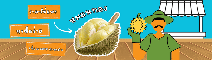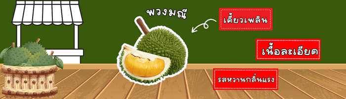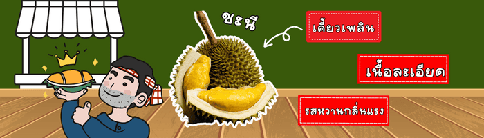 🥭เป็นอีกหนึ่งพันธุ์ยอดนิยม มีกลิ่นแรงเป็นเอกลักษณ์เฉพาะตัว มีขนาดกลางถึงใหญ่ หนักประมาณ 3-5 กิโลกรัม หนามใหญ่ สั้น และห่าง เนื้อในสีเหลืองเข้ม ละเอียด มีเสี้ยนเล็กน้อย รสชาติหวานจัด เมื่อสุกเนื้อจะเละ จึงนิยมนำไปแปรรูปเป็นอาหารหรือขนมหวานต่าง ๆ เช่น ทำเค้กทุเรียน ข้าวเหนียวทุเรียน เพื่อกลบกลิ่นของทุเรียนไว้ให้ทานแล้วอร่อยขึ้นนั่นเองค่ะ