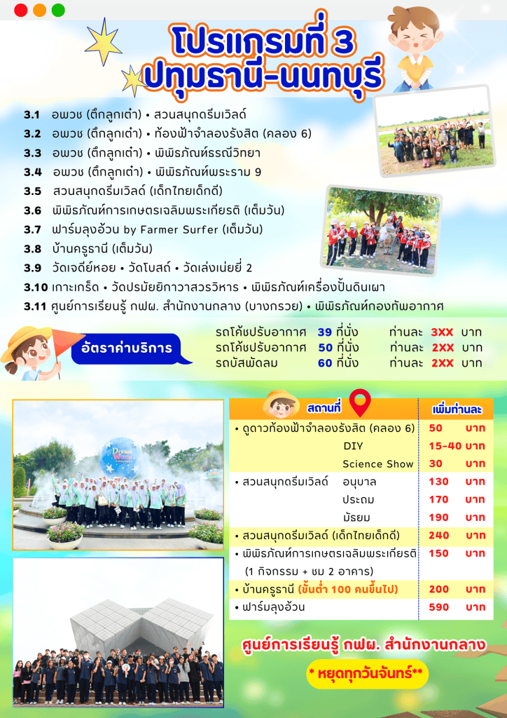 ต้องการชมรายละเอียดโปรแกรมทัศนศึกษานักเรียนเพิ่ม Click ที่รูปภาพด้านล่างได้เลยค่ะ 🥰💙👇