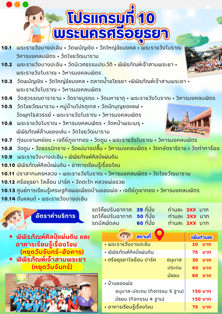10.3 วัดพนัญเชิง • วัดใหญ่ชัยมงคล • ตลาดน้ำอโยธยา • พิพิธภัณฑ์เจ้าสามพระยา • พระราชวังโบราณ • วิหารมงคลบพิตร