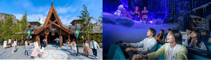เริ่มกันที่โซนแห่งเมืองน้ำแข็ง อิงจากภาพยนตร์ดิสนีย์เรื่อง “Frozen” ให้เราได้เข้าไปอยู่ในอาณาจักรเอเรนเดล (Arendelle) ในช่วงเวลาหลังจากที่เอลซ่าควบคุมพลังได้ ทำให้อาณาจักรแห่งนี้กลับมาอบอุ่นอีกครั้ง และล้อมรอบไปด้วยบรรยากาศแห่งการเฉลิมฉลอง มองเห็นภูเขาน้ำแข็งสูงตั้งตระหง่าน รวมถึงพระราชวังน้ำแข็งของเอลซ่า โดยโซนนี้เครื่องเล่นจะมีความเกี่ยวข้องกับน้ำ เช่น Anna and Elsa’s Frozen Journey ล่องเรือผ่านเรื่องราวผจญภัยของสองพี่น้อง พร้อมกับเพลงประกอบชื่อดังยาวนานกว่า 6 นาที ใครที่เป็นแฟน Frozen ห้ามพลาด!